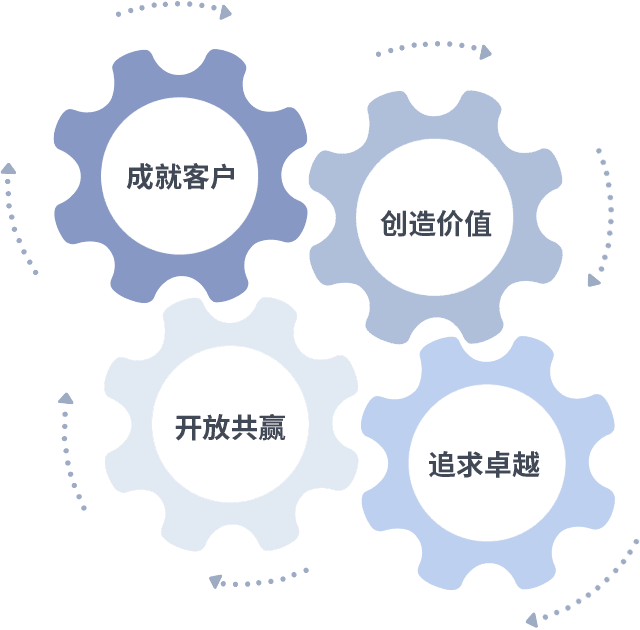 成就客户是一切决策的出发点,,创造价值是衡量所有工作的标准,,追求卓越是我们做事做人的态度,,开放共赢是我们的格局也是最终的结果。。价值观的齿轮环环相扣,,,,推动着组织里的每个人不断向前。。。