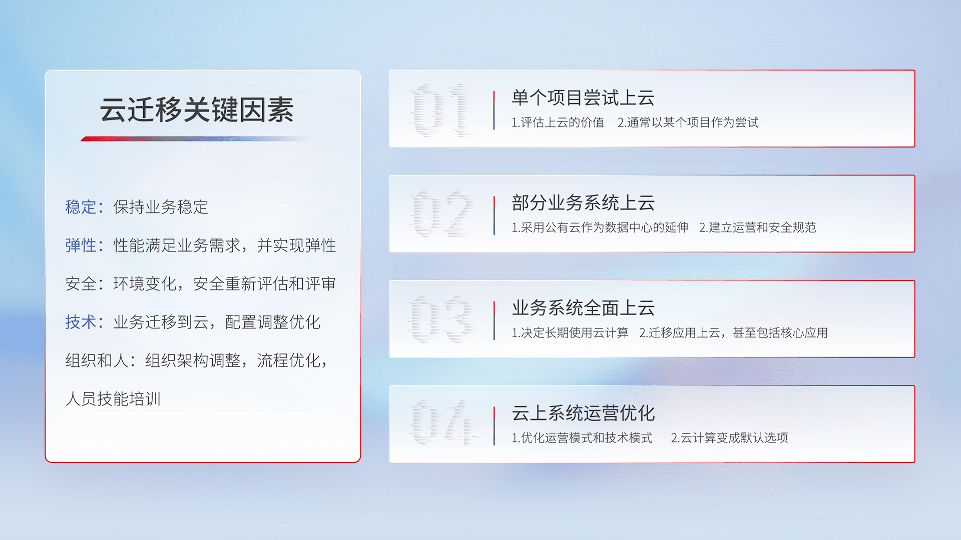 结合实际业务,,从规划设计、、、、云平台选型、、云原生改造、、数据迁移、、集成交付,,,迁移全过程为客户识别最佳上云路径,,,,做好风险识别管理,,,,设计网络架构、、、身份权限、、、安全审计合规、、操作审计、、日志审计、、、、监控告警策略、、、、多站点容灾设计等,,,,对云上基础设施进行整体规划,,提升IT治理水平,,,以满足弹性、、、高可用、、、高性能的需求。。。。