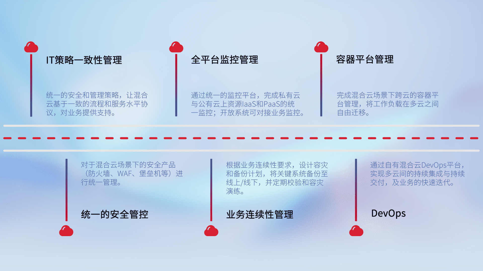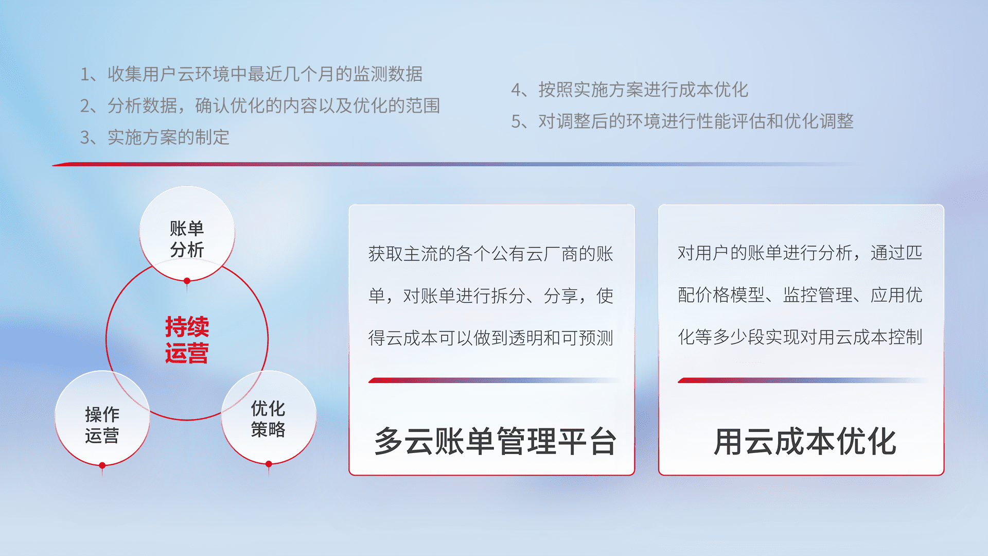 通过多云纳管,,以统一的资源数据模型把客户的云资源进行抽象和封装,,进而实现对多云资源的统一操作,,保障云资源管理的可靠性、、稳定性与可用性。。。。量身定制化运维内容,,配置、、、开发运维、、、补丁管理、、、、备份、、监控、、认证和访问管理、、、、审计和日常巡检等,,,保障在用云过程中的可靠度,,稳定度以及高可用率。。